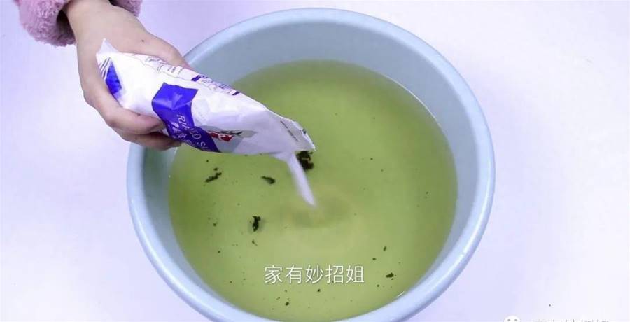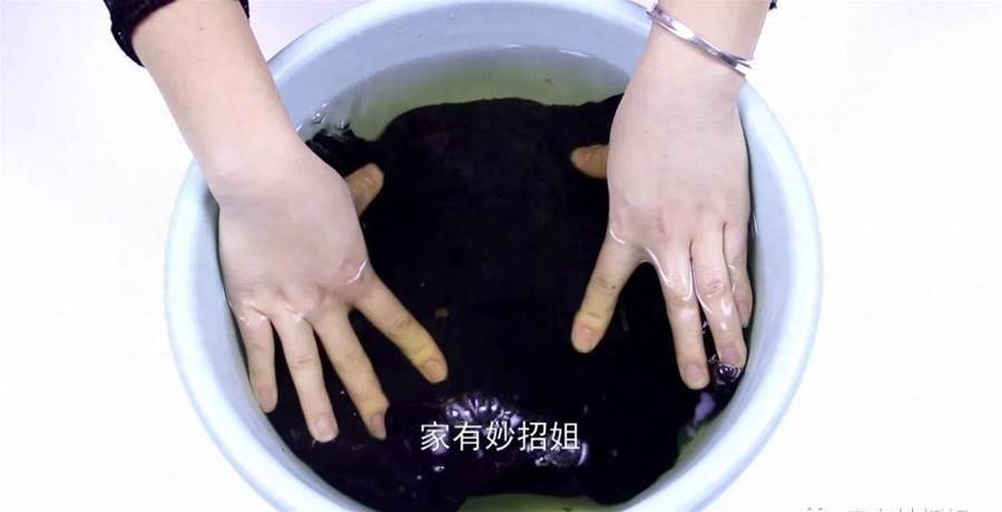 我們時間浸泡的差不多了,就可以來搓洗褲子。食鹽有固色的作用,經過鹽水的浸泡,褲子掉色的情況就會好很多。而茶葉水能去除異味,可以將褲子上殘留的異味都清除掉。