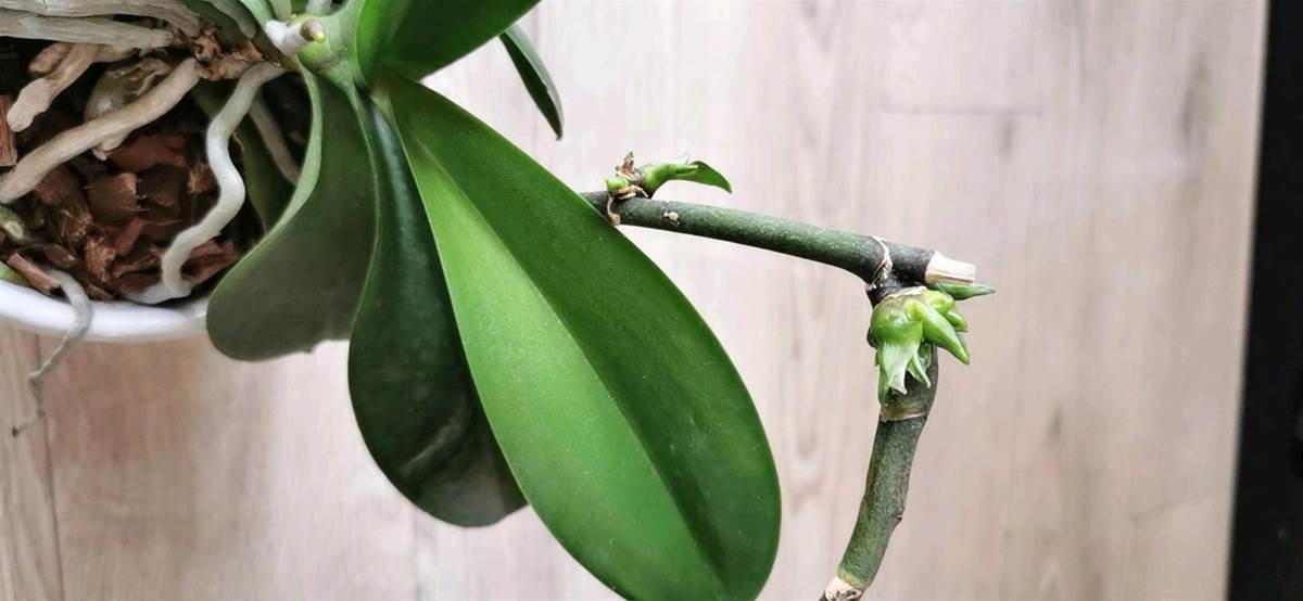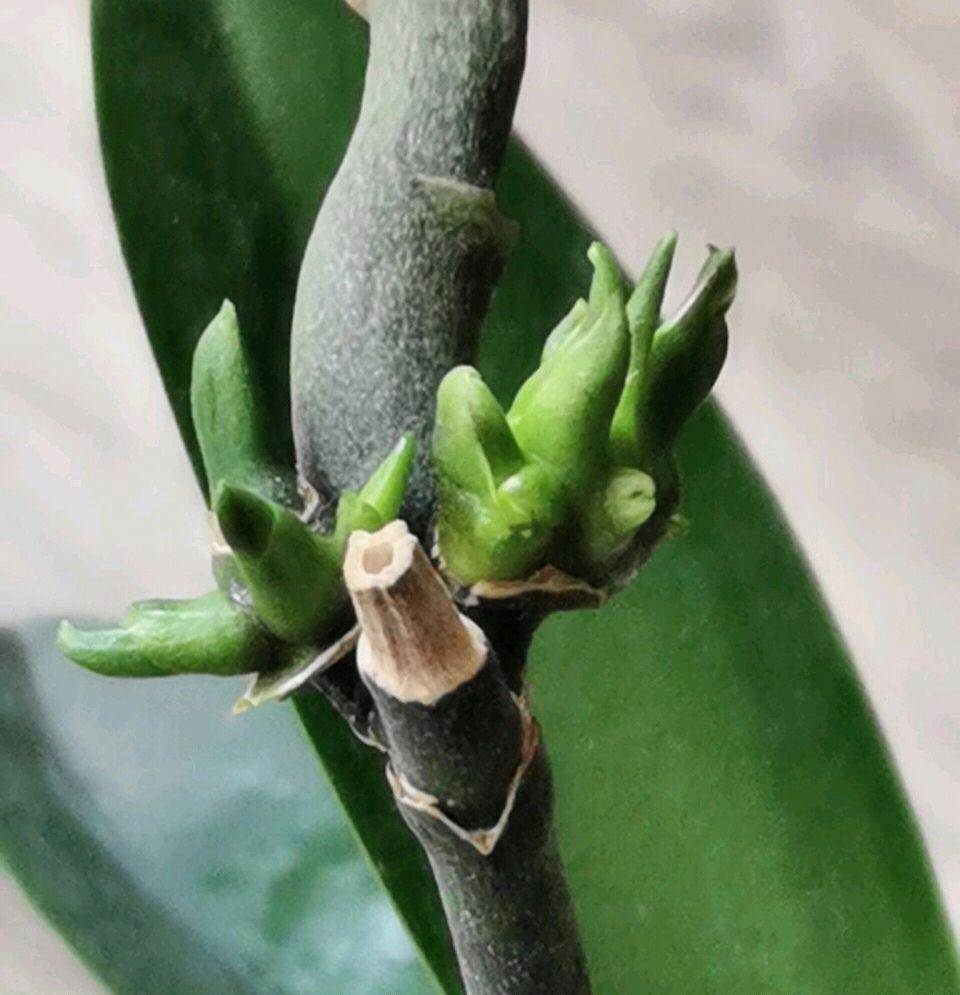 謝花的胡蝶蘭要想再次開花,花友們常用的辦法是直接修剪謝花的花梗,當然不是修剪平齊基部,而是留下四分之一的花梗,如上圖,然后澆灌和噴霧磷酸二氫鉀養護,一段時間以后,可以在花梗的位置處再次抽出花芽來開花,這是一般的做法,而今天我們分享一種爆芽的方法,不需要修剪花梗。