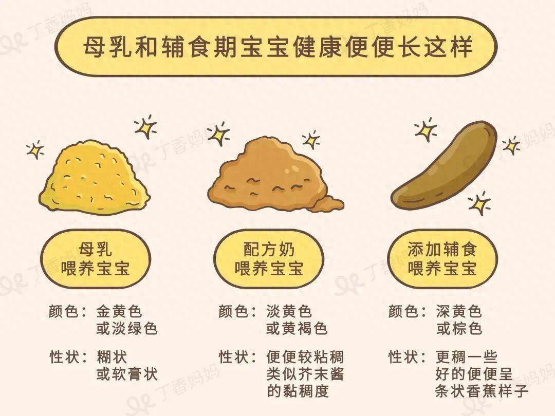 母乳期寶寶的便便通常是不太成型,對于母乳寶寶和輔食期寶寶健康便便可以參考下圖:
