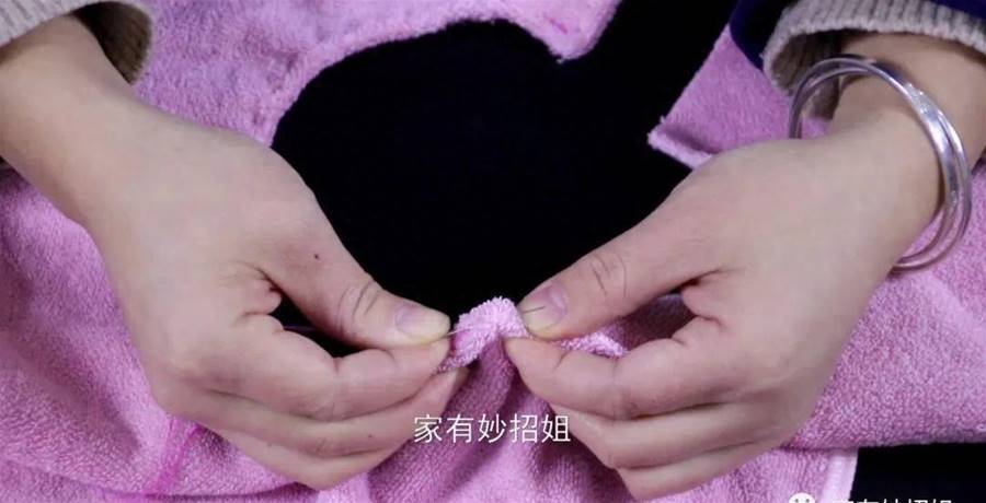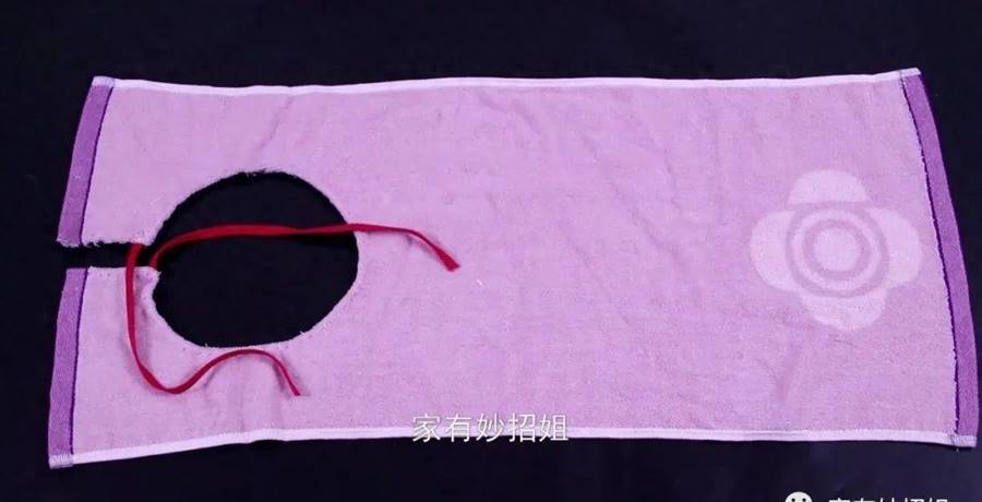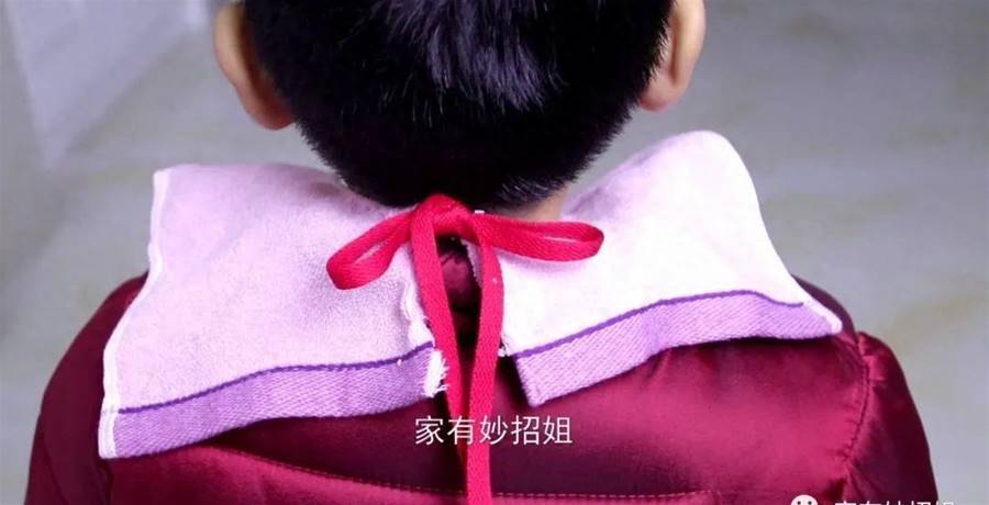 家里有小孩的,孩子每次吃飯都會將湯汁滴落在衣服上面,特別是現在天氣寒冷,穿的衣服都比較厚,衣服一弄臟,又需要去清洗,非常的麻煩。這個時候,我們就可以利用上改造好的毛巾。將毛巾中間的大圓套在脖子上,后面用繩子固定好,這樣就變成了一個圍兜。