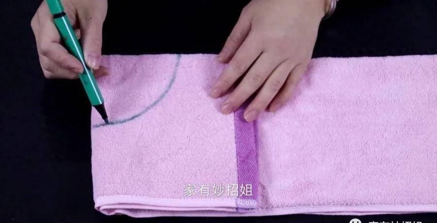 接下來,我們用記號筆在毛巾折疊的部分畫出一個弧形的標記,然后用剪刀沿著我們標記好的弧形將毛巾剪開來。