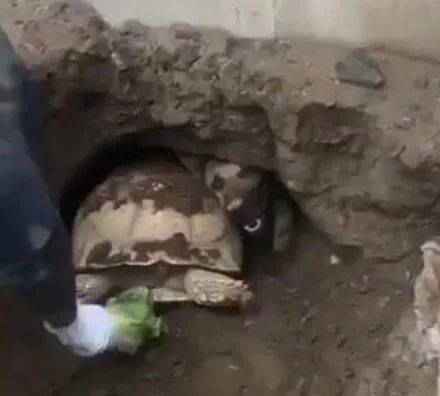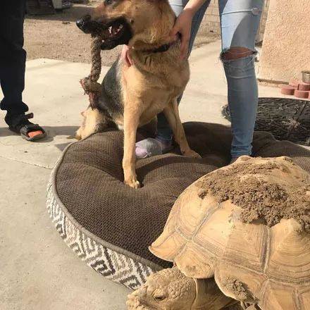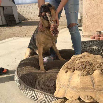 挖好之后烏龜就開開心心的邀請家里的德牧去玩