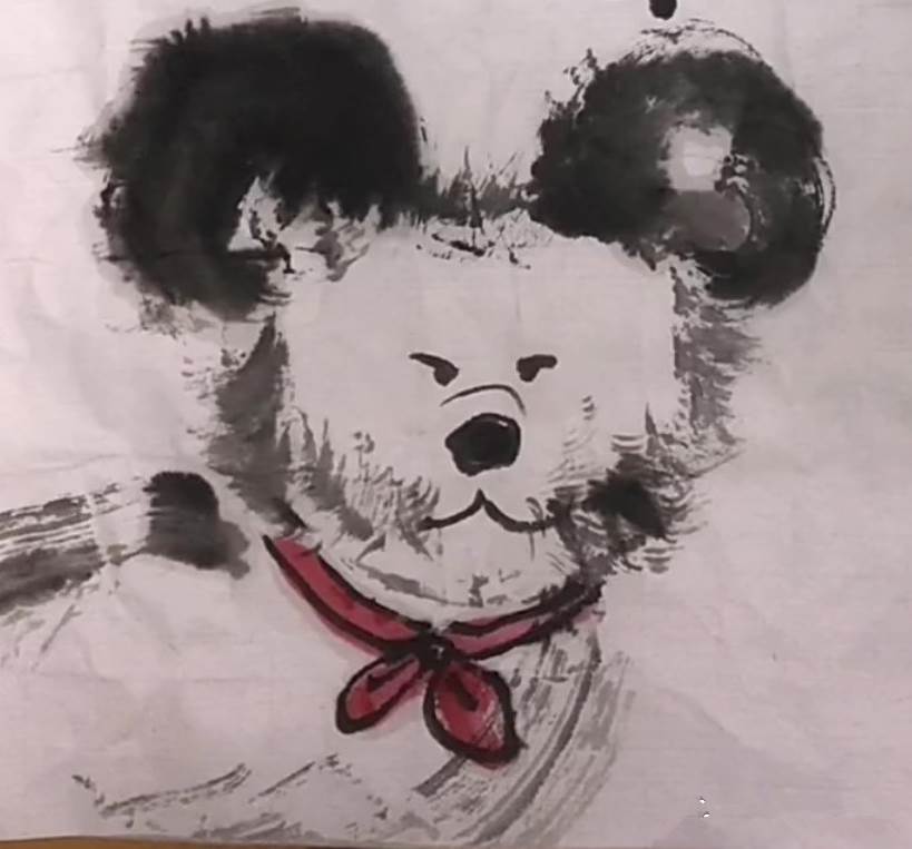 原來畫中的狗子是一隻秋田犬,因為才幾個月大的原因,牠的樣子還沒有完全長開來,2只大大的耳朵[火乍]著毛。這幅畫和狗狗之間,不能說是毫不相干,可以說是一模一樣啊!本以為這是個抽象畫呢,沒想到這麼寫實。