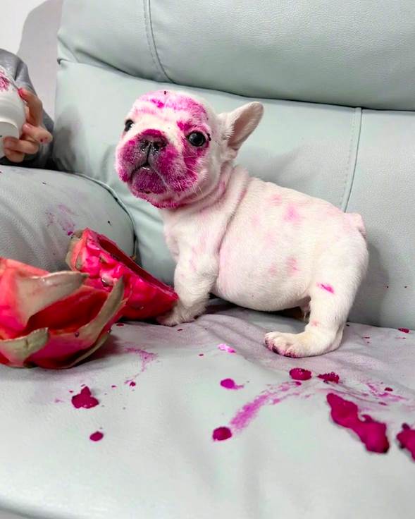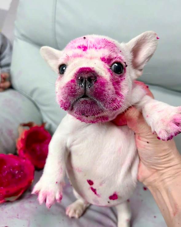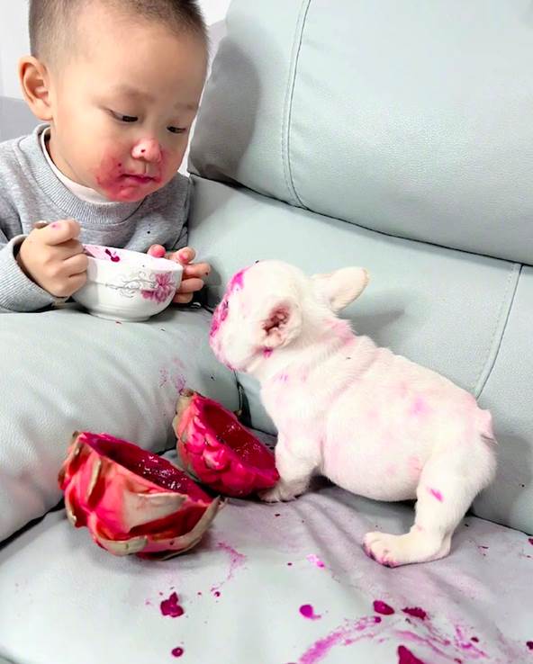 ▼ 沒想到的是,狗狗竟然把火龍果的皮給叼到沙發上來了,然後把頭埋進去和兒子一起吃呢!等到網友發現的時候已經太遲了。不僅是沙發上都被染成了紅色,狗狗和兒子的臉都變紅色了!