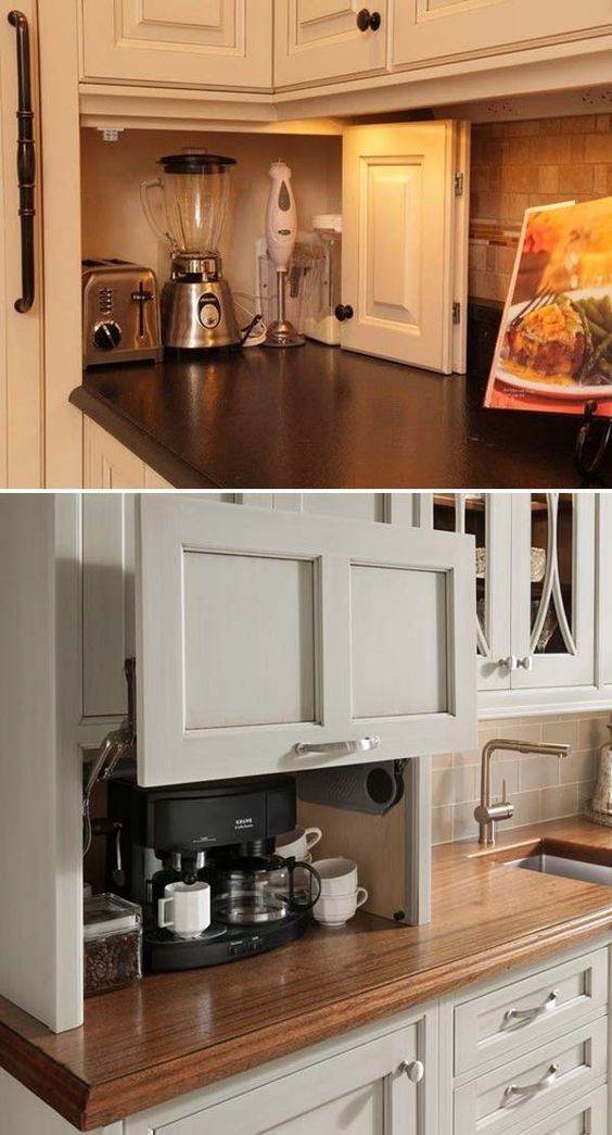 常規廚房裝修多是吊櫃+地櫃,空出不少檯面,但對于一些邊角區域利用起來著實有限,不如多裝一道小門設小家電收納專區,不用時櫃門一關,檯面依舊整潔。