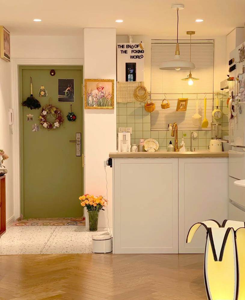 轉角設吊櫃+地櫃,往往因其深度,導致拿取不便,甚至還會出現櫃門打櫃門的情況,不妨改成轉角儲物間,滿足大容量收納的同時,以上小毛病統統解決,即便不打算放雜物,也能輔助收納一些家電和清潔工具,這點你們看著來就好。