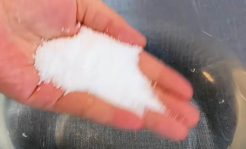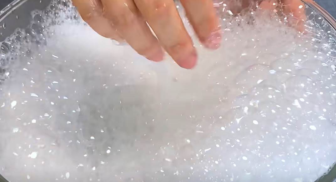 水不需要太多,然后倒入我們平時用來洗衣服的洗衣粉。將洗衣粉倒入后,用手攪拌均勻,使洗衣粉完全溶解。攪拌到這個程度基本上就可以了。