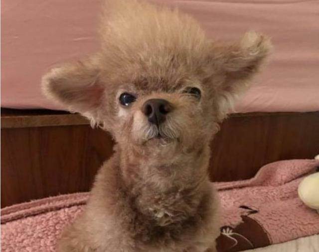 在這只泰迪小的時候,只是發現牠有飛耳的跡象,沒想到長大後,就越來越像羊駝了。頭頂上的一團毛特別的蓬鬆,而且還長,嘴巴也是比較長的,只看這只狗狗的頭,真的覺得跟羊駝沒什麼兩樣。