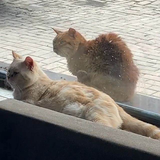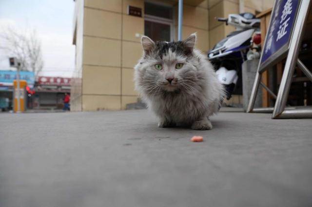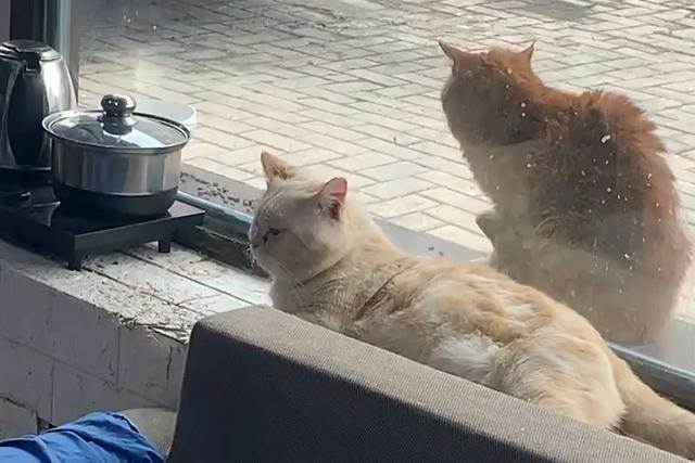 然而,當流浪貓的頭碰到冰冷的玻璃時,它才意識到眼前有一道透明的屏障,阻隔了自己與屋里的人,流浪貓的眼神中閃過一絲落寞,尷尬地把頭轉了回去,假裝若無其事地喵喵叫了幾聲。
