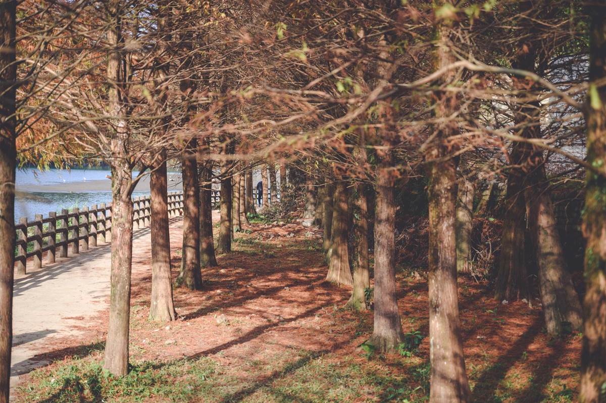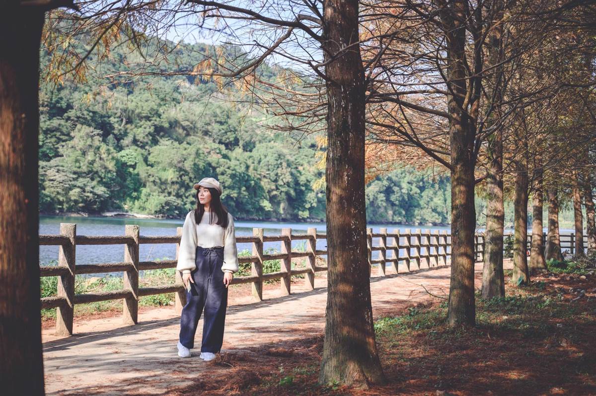 隨著湖畔步道向前,迎面而來是濃厚冬意的落羽松,彷彿鋪上了一層紅棕色地毯,美到讓大家頻頻發出讚嘆,隨手一拍都是異國景色。
