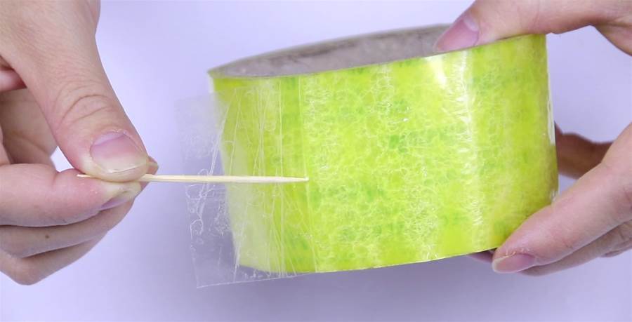 如果家里的膠帶找不到膠帶頭,先不要用手來回地搓,這樣很有可能會讓膠帶粘得越緊,就更不好找膠帶頭了。其實只需要用到我們家家都會有的牙簽,我們用牙簽在膠帶上劃一圈,要是我們劃的時候有頓挫感或者粗糙感的話,那膠帶頭就是在這個位置了。