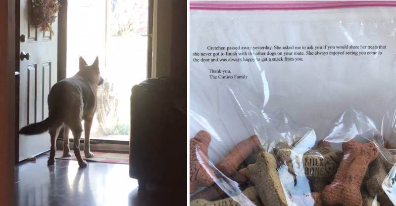 信上寫著:「Gretchen昨晚過世了,牠要我問你可不可以把這袋牠再也吃不完的零食分給你沿路餵養的其他狗狗。牠一直都很享受你來到門前的時候,也很喜歡你給的這些零食。謝謝你,Cimino一家。」