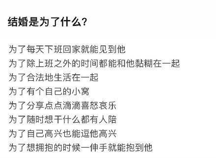 為了每天下班回家就能看到他;為了除上班以外的時間和他黏在一起;為了有個自己的小窩,分享你的喜怒哀樂;為了隨時隨地有人陪;為了想擁抱時一伸手就能抱到他……