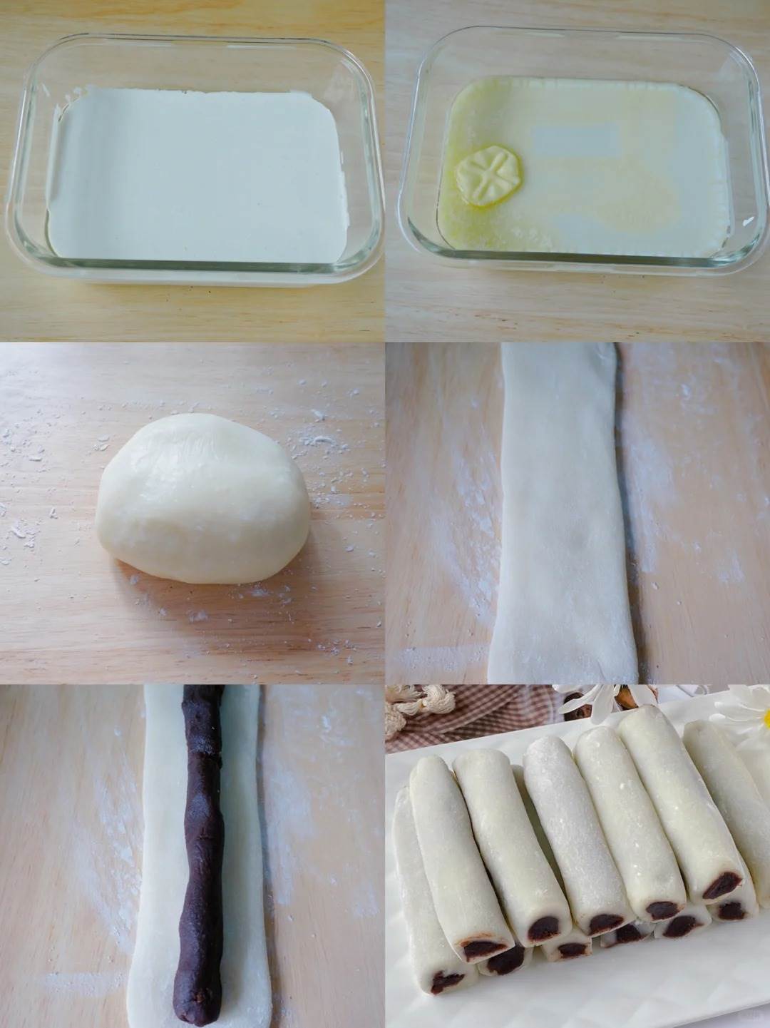 4. **包入豆沙餡:** 在案板上撒一些熟糯米粉防粘,取其中一份面團搟成長條狀,將豆沙餡放在面團上,卷起來并捏緊收口,然后切成大小均勻的小段即可。另一份面團重復同樣的操作。