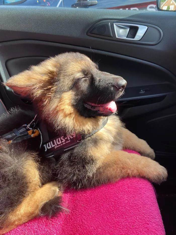 雖說牠們「丟掉」了工作,但日子過得卻不差,鏟屎官有空就會帶著牠們出去遊玩,看這只坐在副駕駛的小德牧,還瞇著眼睛笑著呢,這傢夥是有多開心?
