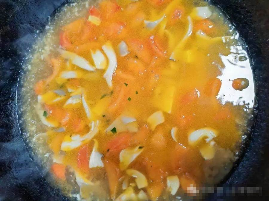 3、西紅柿炒出湯汁以后,放入蘑菇,翻炒均勻,加生抽和蠔油,再次炒勻,炒個兩三分鐘后,倒入適量的清水,蓋上蓋子煮至開鍋。