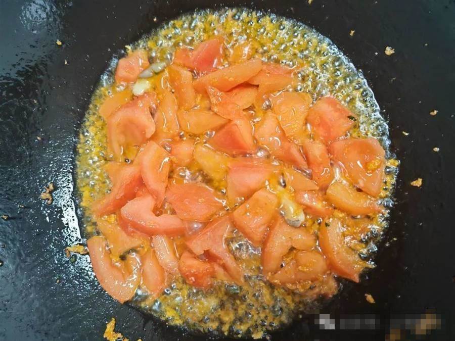 2、起鍋燒油,油熱后放入西紅柿,加一點鹽,翻炒翻炒。