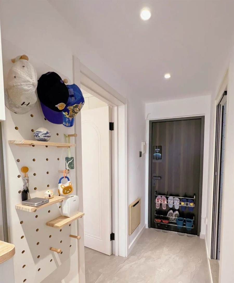 進門處空間位置有限無法做玄關柜,所以鞋柜不在門口,但沒有條件可以創造條件,設計師建議在墻面裝了不占空間的壁掛折疊換鞋凳,結合門上的拖鞋掛架,方便進出的時候坐著換鞋。