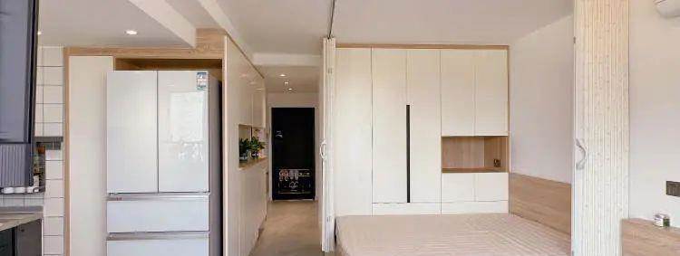 這套 50 ㎡ 的房子位于北京海淀區,屋主為了方便業主兩個兒子上學,因此三代人同住在這里。設計師將主臥做成上床下桌,又設計出一個榻榻米床,滿足了小朋友想要的樹屋,同時將客廳和廚房在一起,隔出一個靈活的老人房,陽台就成為了用餐區,這樣一家人都能得到好的休息,還不顯擁擠。