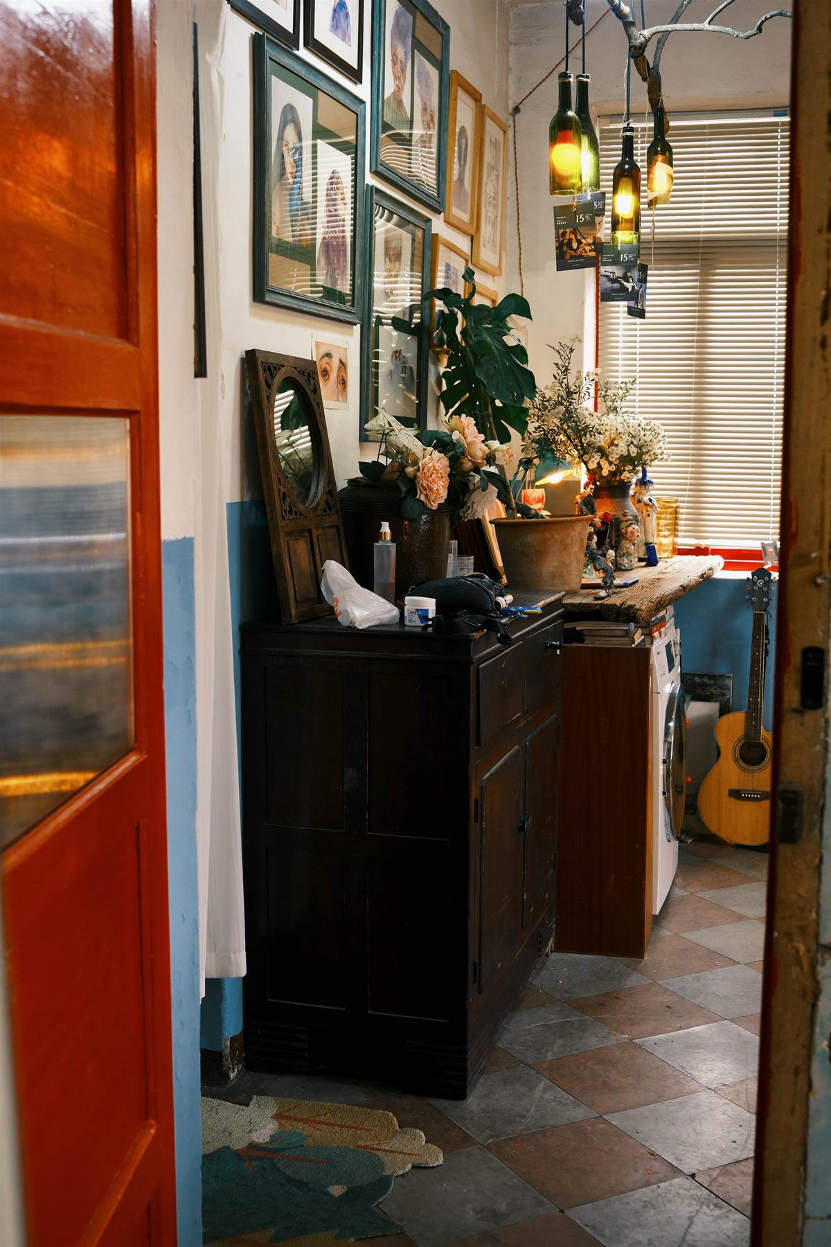 王仙解釋道,因為房子本身偏舊,想要把它改造得與新房一樣需要耗費很大的成本,因此他選擇了復古風,并盡可能地自己制作傢俱,比如室內燈、零食柜、壁畫和狗屋都是出自他手,其中燈還是由廢舊的酒瓶和從山上撿來的樹枝制作而成。