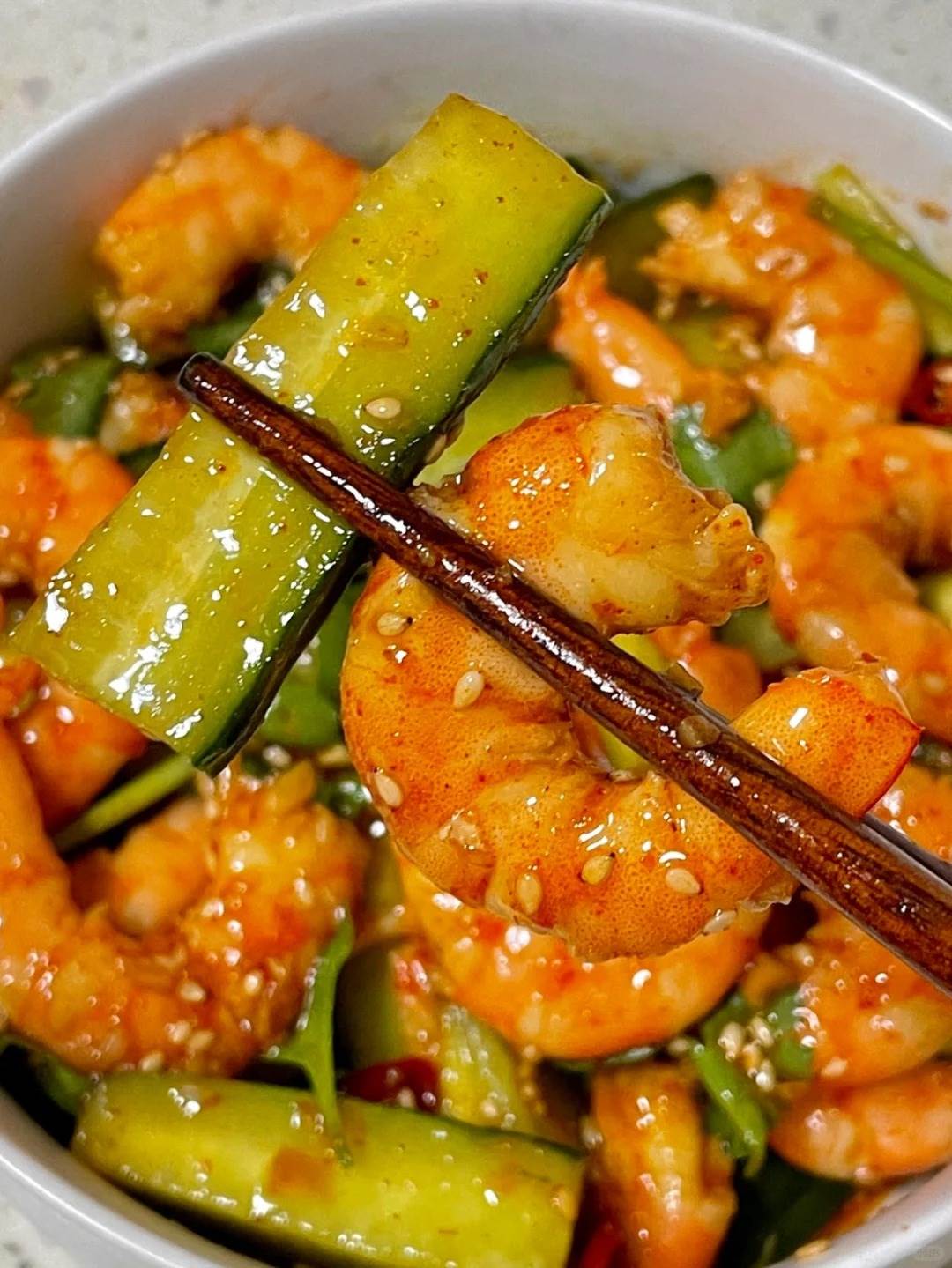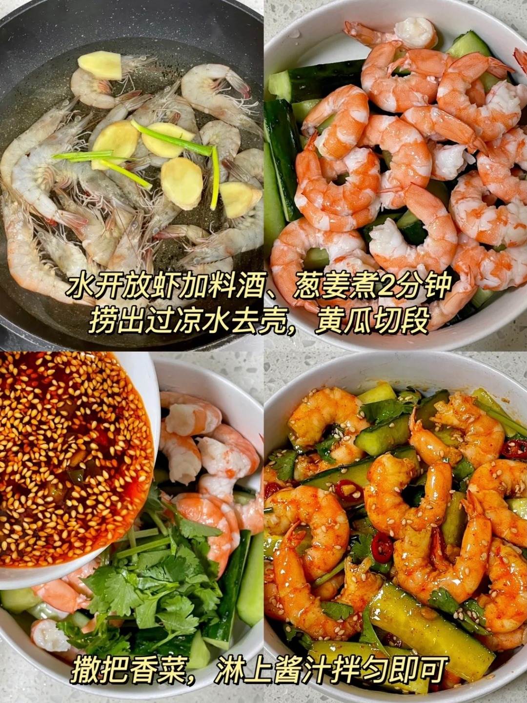 2. 將水煮開后放入蝦,加入料酒、蔥姜煮2分鐘后撈出,過涼水并去掉蝦殼。3. 黃瓜切成段,將蝦仁和黃瓜全部放入碗中,撒上香菜并淋上之前調好的醬汁,拌勻即可。