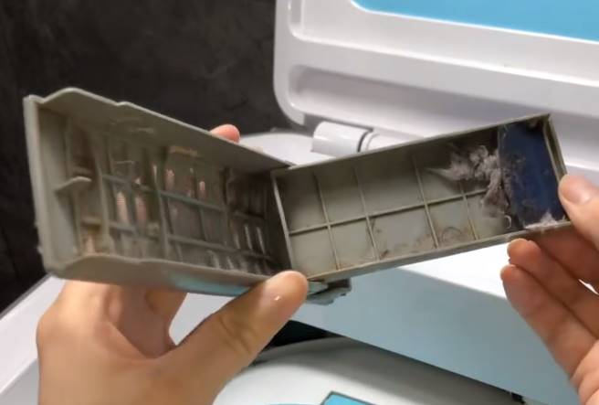 我們將這個盒子打開可以看一下,里面已經累積了很多的污垢,毛絮的,看起來是非常的臟,如果日積月累不將它清洗干凈,這樣洗出的衣服也會很臟。很多人都忽略了這個地方,所以在以后洗衣服大家最好把它經常清理一下,這樣洗出的衣服也是更加的干凈,洗完后我們再把它放回去就可以了。