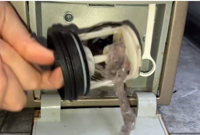 打開后我們可以看到有一個圓形的蓋子,然后我們直接逆時針將它擰開即可,這個就是洗衣機的排污口,大家可以看一下,太臟了,里面都是毛絮、污垢等,如果不將它清洗干凈,就會滋生大量的細菌,而且還會發出難聞的異味,所以我們一定要定期的清理一下之后再把它放回去就可以了。