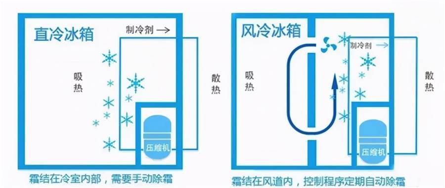 冰箱主要分兩種,風冷和直冷,最大的區別就是直冷會結霜,而風冷不會,也正因于此,現在市面上大都是風冷冰箱了,直冷逐漸面臨被淘汰。