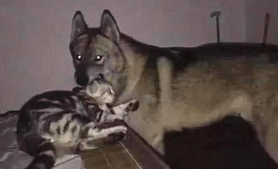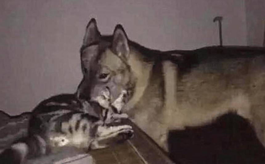 原來是大半夜狗狗不睡覺對著貓咪的頭不停的舔呢,還張大嘴巴把貓咪的頭咬在了嘴里,這場面還一度十分地混亂呢,估計是兩個小冤家又開始打鬧了,女子也不知道不該說些啥是好呢,趕緊把他兩分開了。