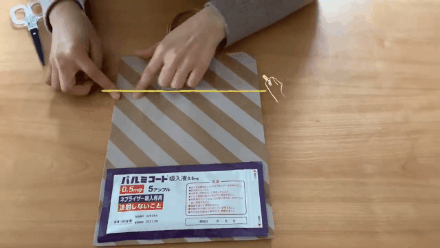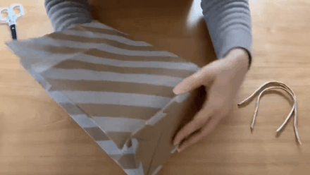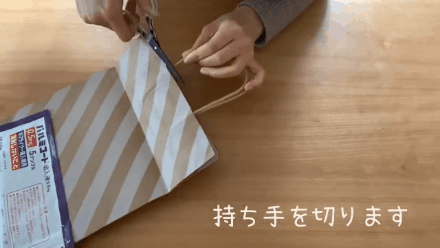 黃線的位置是:比收納盒高度再高出一半距離的位置(看圖就懂啦)。選取好位置后,先這樣折疊一下。剪掉提手,方便后續折疊操作。